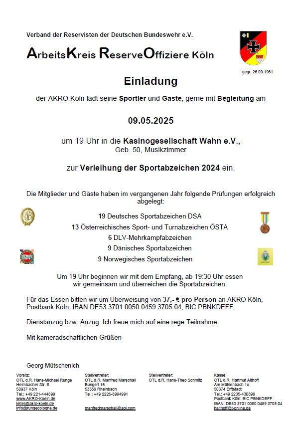 Sie haben 11 Abzeichen in Gold, 8 in Silber und 11 in Bronze errungen. Die sportliche Leitung hatte wieder ein Kamerad der belgischen Streitkräfte. Er hat in diesem Jahr zum 26. Mal die Übungen in der Luftwaffenkaserne Köln-Wahn abgenommen. Der Verband der Reservisten der Deutschen Bundeswehr hat ihn für diese bemerkenswerte ehrenamtliche Tätigkeit mit dem Ehrenzeichen in Bronze ausgezeichnet.